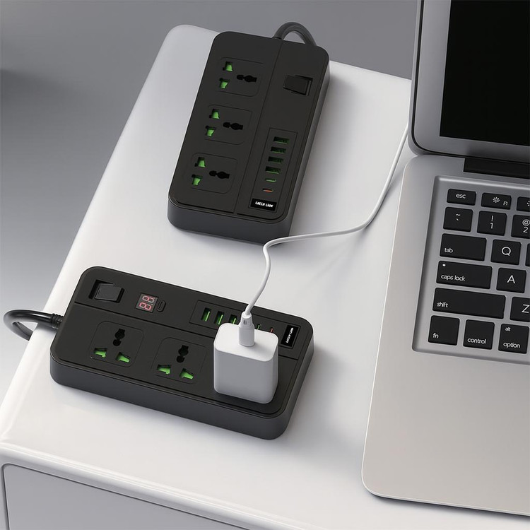 این مدل دارای سه سوکت یونیورسال سازگار با انواع دوشاخههاست. همچنین، در سمت راست خود، چهار پورت USB-A و دو پورت USB-C دارد. این تنوع بالا باعث میشود تا بتوانید همزمان چند گوشی، تبلت، هدفون، پاوربانک و حتی اسپیکرهای شارژی را با آن شارژ کنید. پورتهای USB دارای قابلیت تشخیص شدت جریان خودکار هستند که موجب شارژ ایمن و سریع میشود.